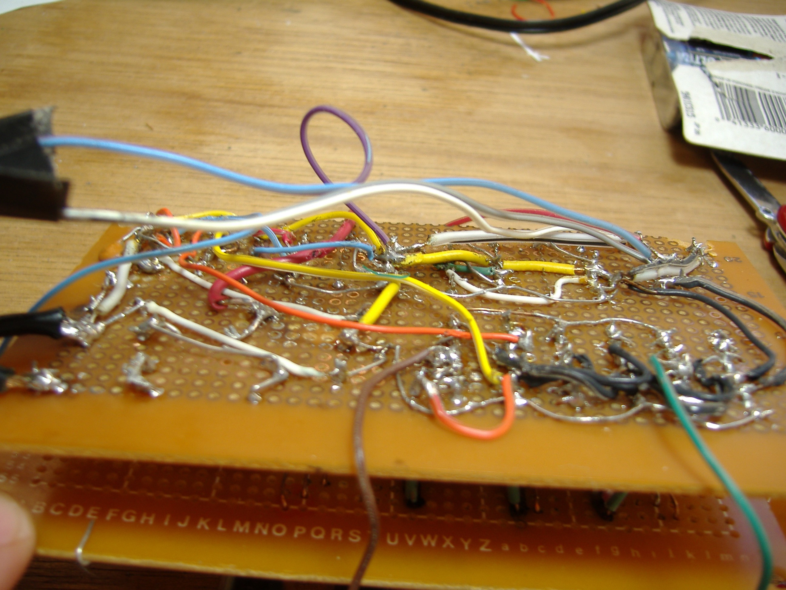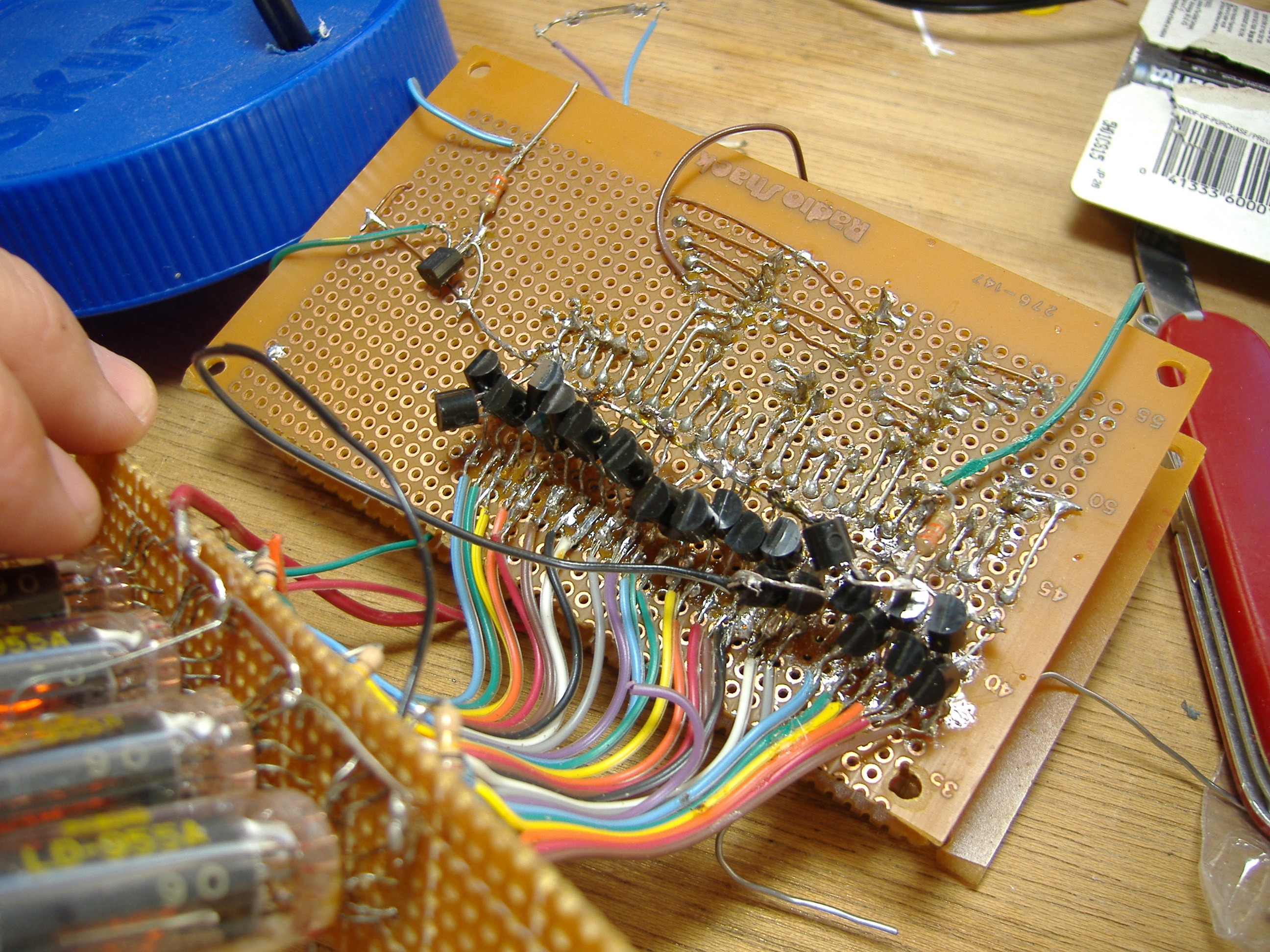 The clock was built using perfboard. Despite looking more like a prototype than a finished piece, it has worked reliably for several years.