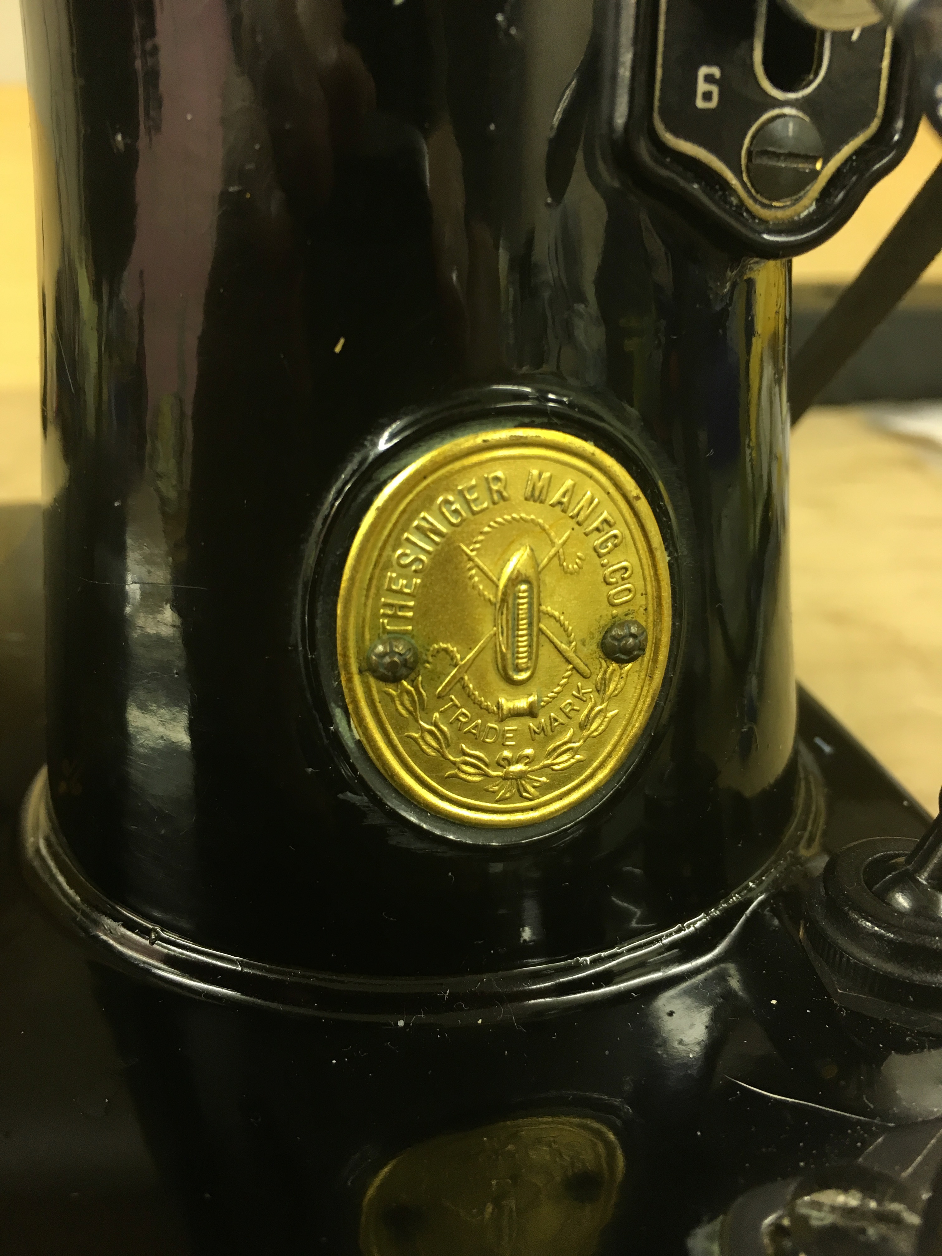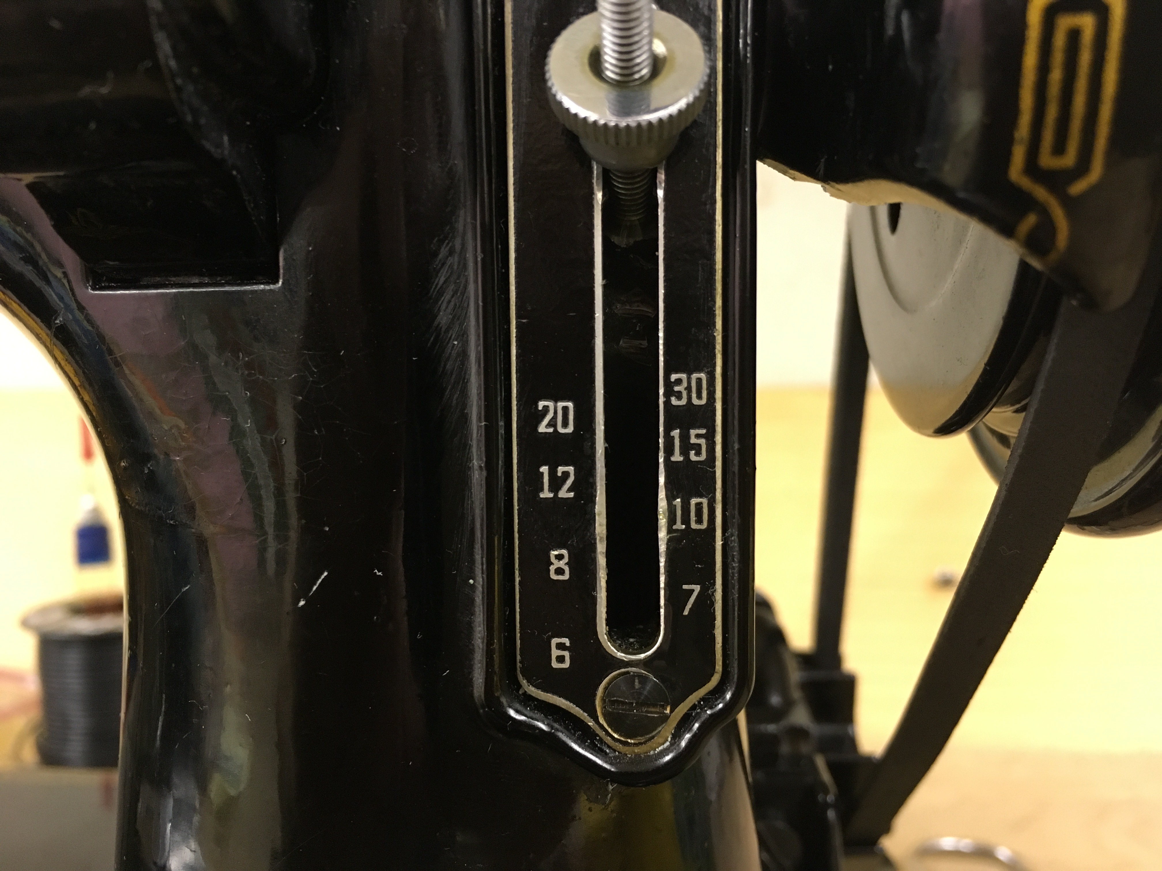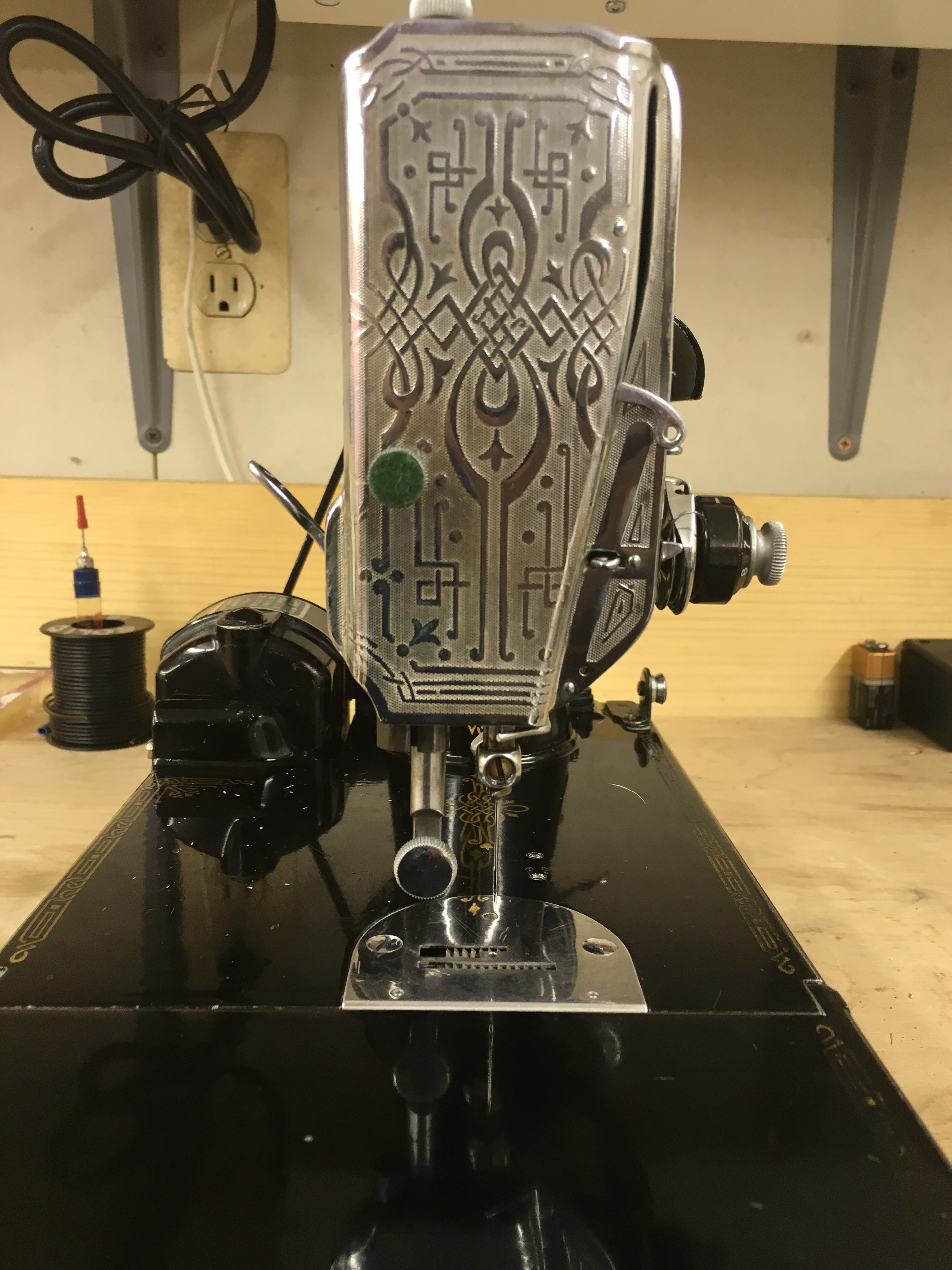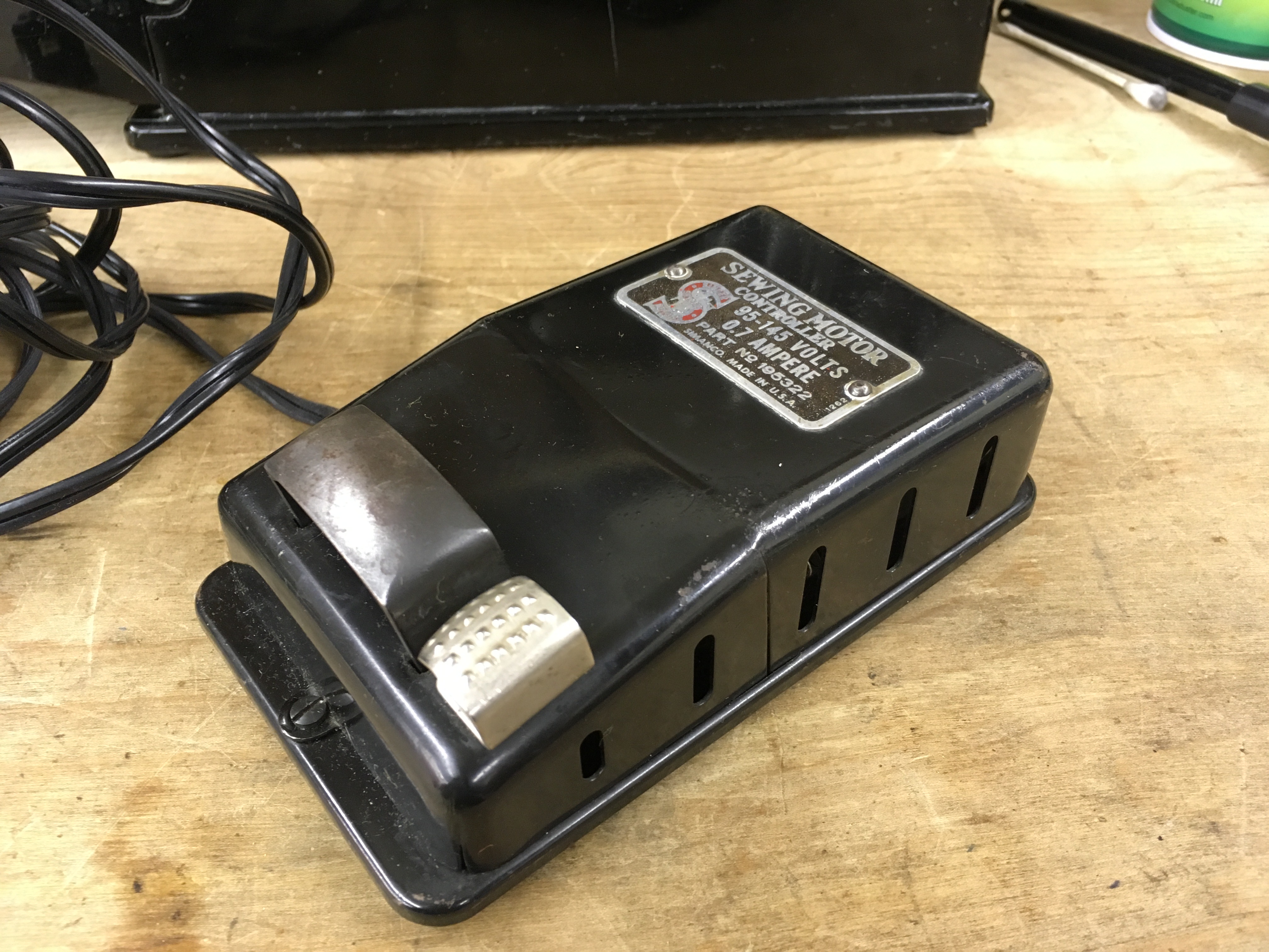 This machine came with the steel foot controller rather than the bakelite version. These made a brief reappearance to the model line in the late 1940s: