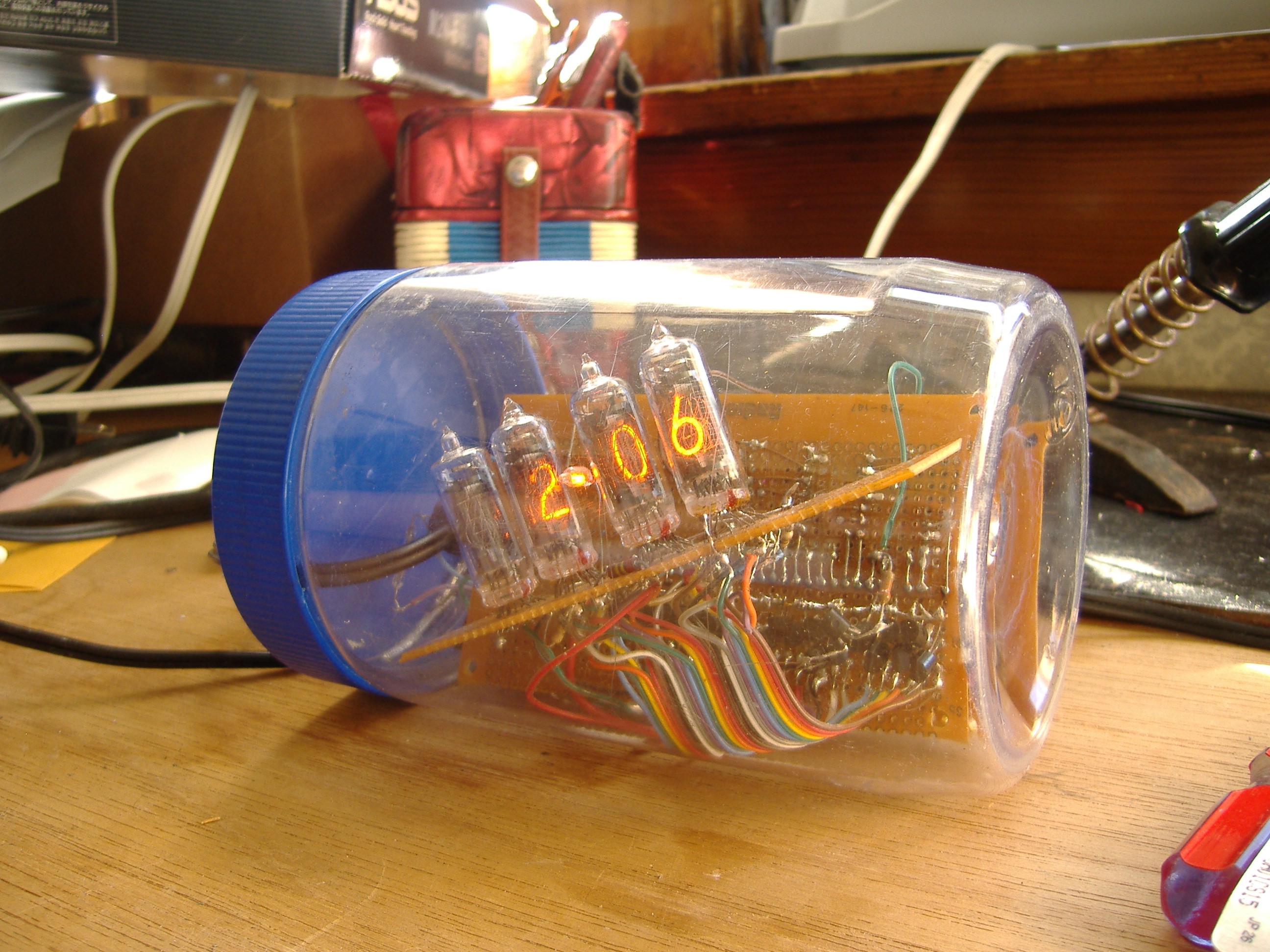 This is a clock that I built in 2001 using parts from an old calculator. The clock uses an antique digital display technology known as NIXIE tubes. It's housed in a peanut butter jar for the time being—I hope to find the time build a nicer enclosure soon, perhaps out of anodized aluminum.