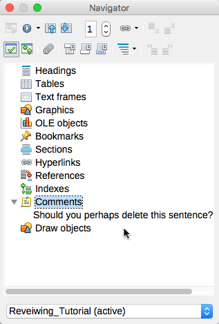 - To navigate among the comments in the file, click on the "View" menu and then select "Navigator." Click on the comments you wish to navigate to under the "Comments" category.
